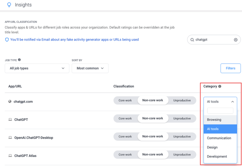 You’ll see the list of Apps and URLs with their classification and categories. From the Category column, you can click on the dropdown menu for each App/URL and select a category that best describes it.
