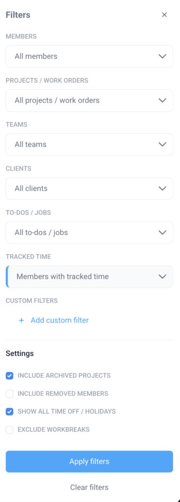 In the top left corner of the report header, you will see the Members filter, where you can choose whether to generate a report for yourself or your team.