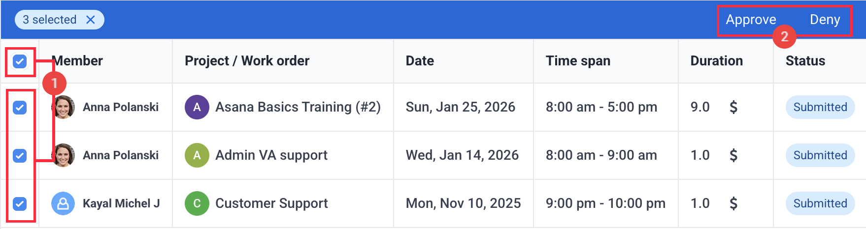 To bulk approve/deny manual time additions, click on the checkbox located in the top left corner of the table, or select multiple individual checkboxes, then click on Approve or Deny.