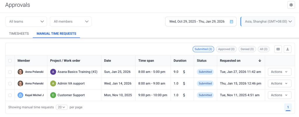Only organization owners, managers, and team leads (when enabled) are allowed to approve time edits.