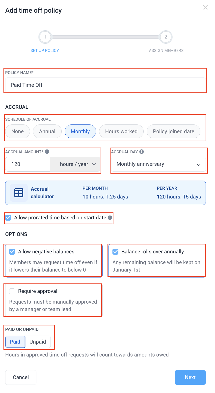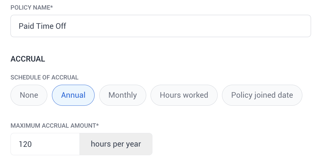 You can choose the Monthly accrual method to grant your team a set number of hours each month, or a total number of hours per year that are automatically divided and accrued on a monthly basis.