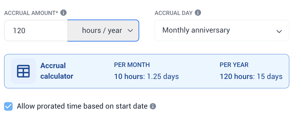 You can choose the accrual day too, which can be on their monthly anniversary, the first day of the month, or the last day of the month.