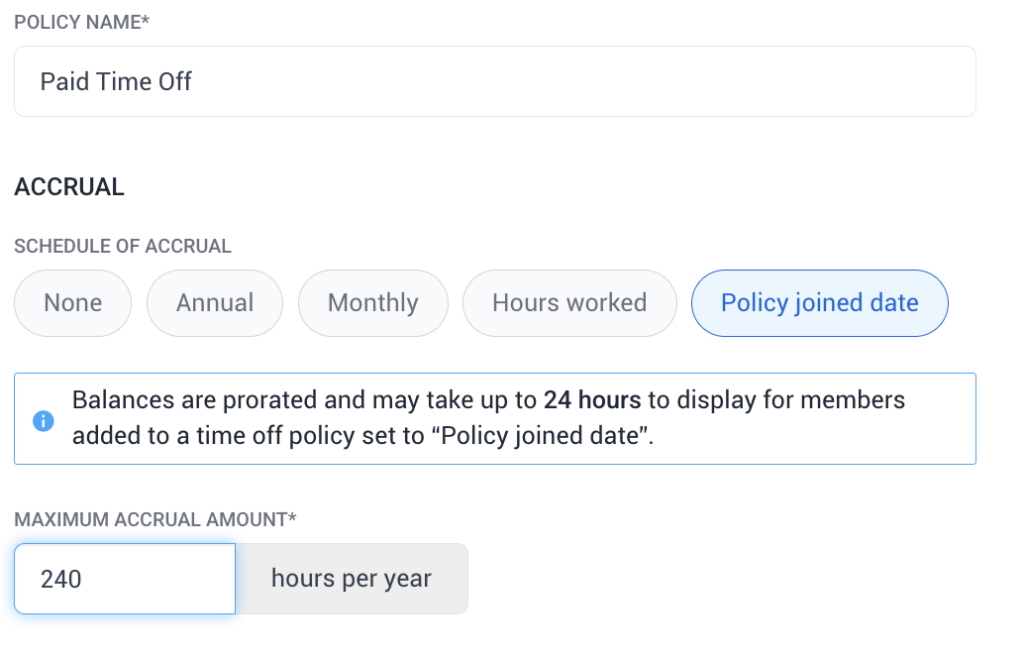 - Allow prorated time based on start date – Available only for monthly accrual. When selected, time off will be earned on a prorated basis based on the employee’s start date (e.g., starting mid-month).