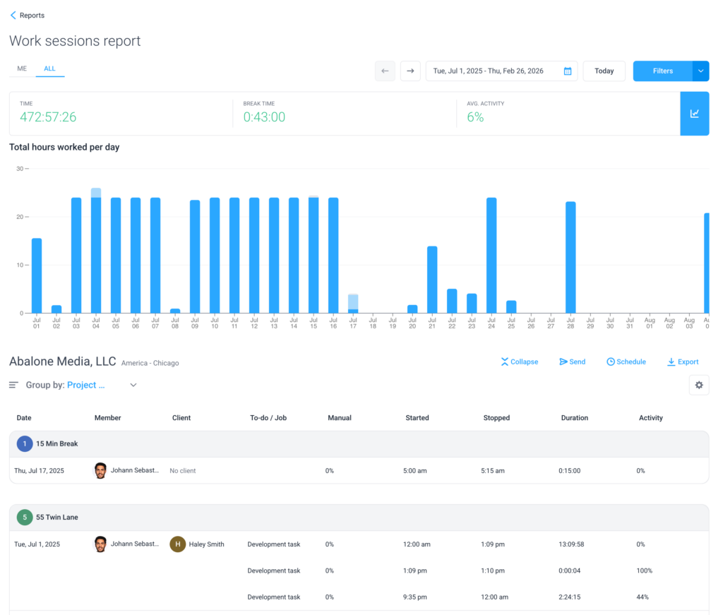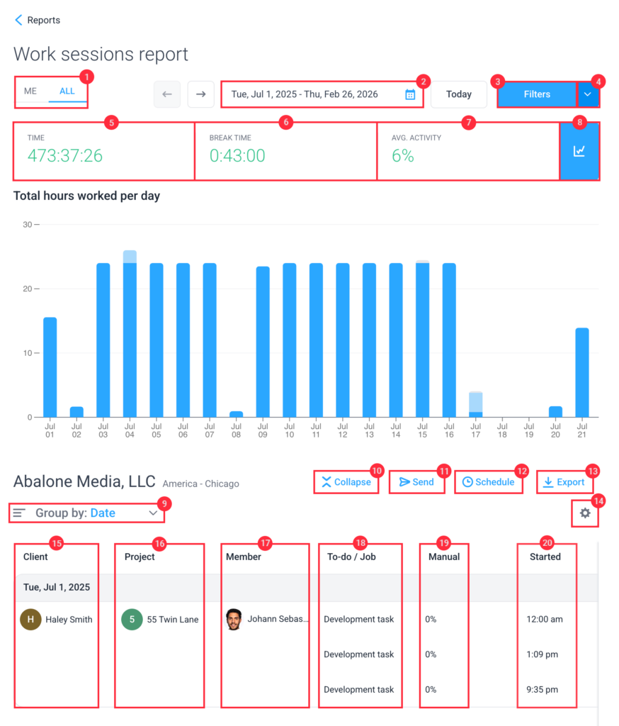 Work session reports allow you to display and/or download timer start and stop data for yourself or your team. The report also contains specific details for each session, including clients, projects, members, to-dos/jobs, the amount of manual time tracked per session, session duration, and activity levels per session.