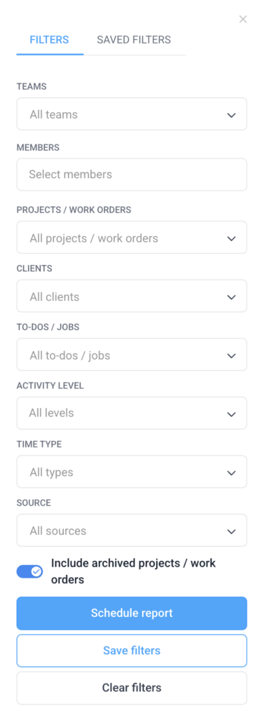 - Filters – clicking on the Filter button lets you select which filters you’d like to apply. For this report, you can filter the data by teams/members, projects/work orders, clients, to-dos/jobs, activity level, time type, and source.